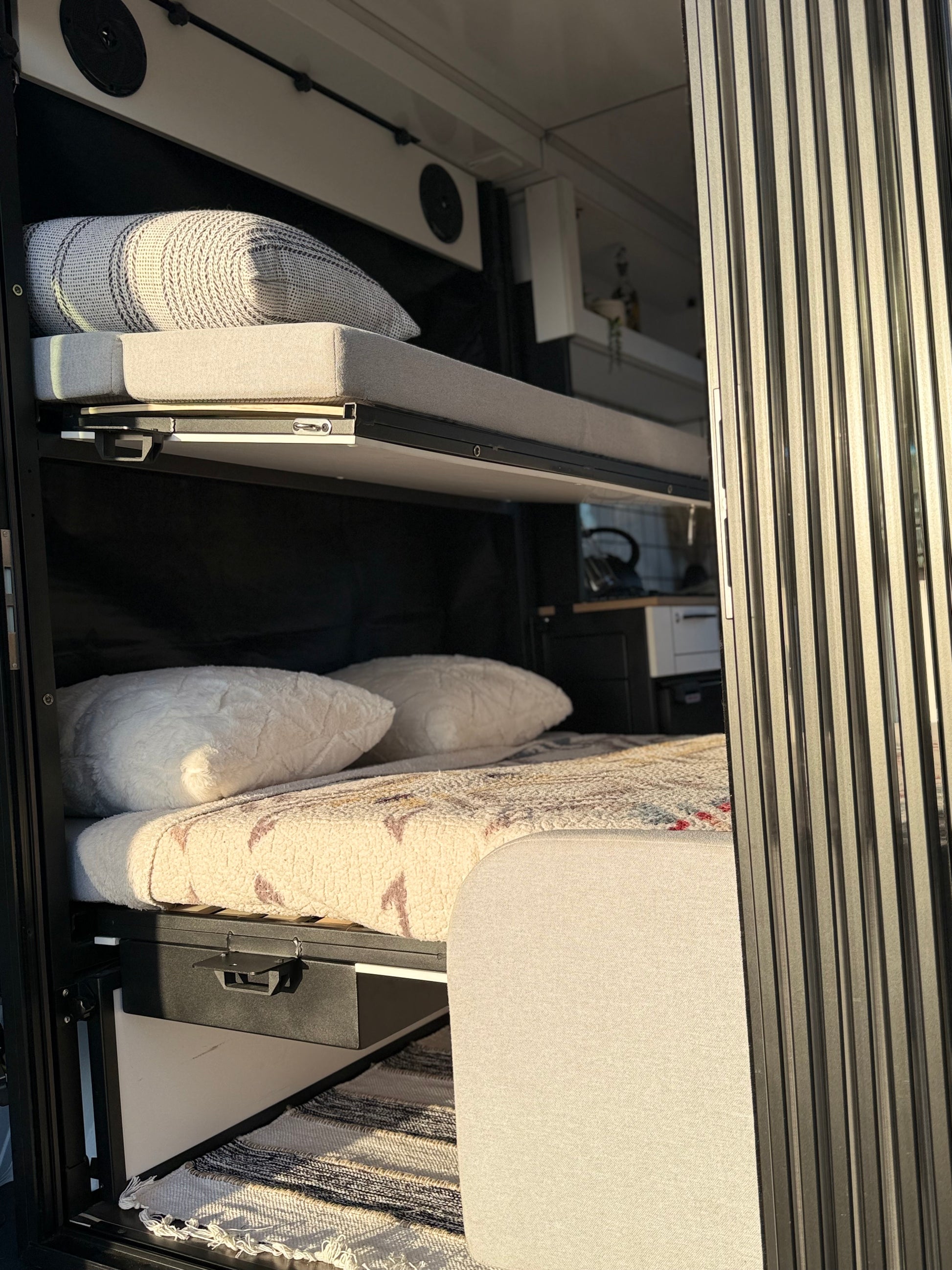 Traveling with little ones? Our folding kids' bed offers a practical solution, easily stowing away above the bed or couch area when not in use. Want the convenience of showering on the go? Opt for our shower box addition. Please note: selecting this feature removes the driver/passenger seat doorway, making side and rear doors the primary entrances to the living space.