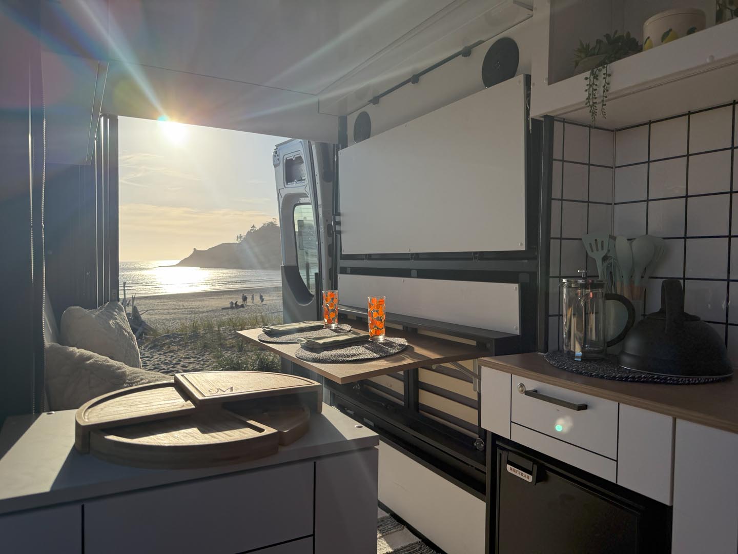 I’ve been researching van conversion kits for a while, and I’m so glad I decided on the Ram Promaster kit. The cabinets and backsplash are gorgeous, with a smooth finish that feels high-end. The kit was easy to customize to my specific van model and options I wanted, and the installation process was straightforward. I also love how well-ventilated and ergonomic the layout is—it’s clear a lot of thought went into the design. You open up the door and your backyard is whereever you park. This kit turned my basic van into a functional and beautiful home!