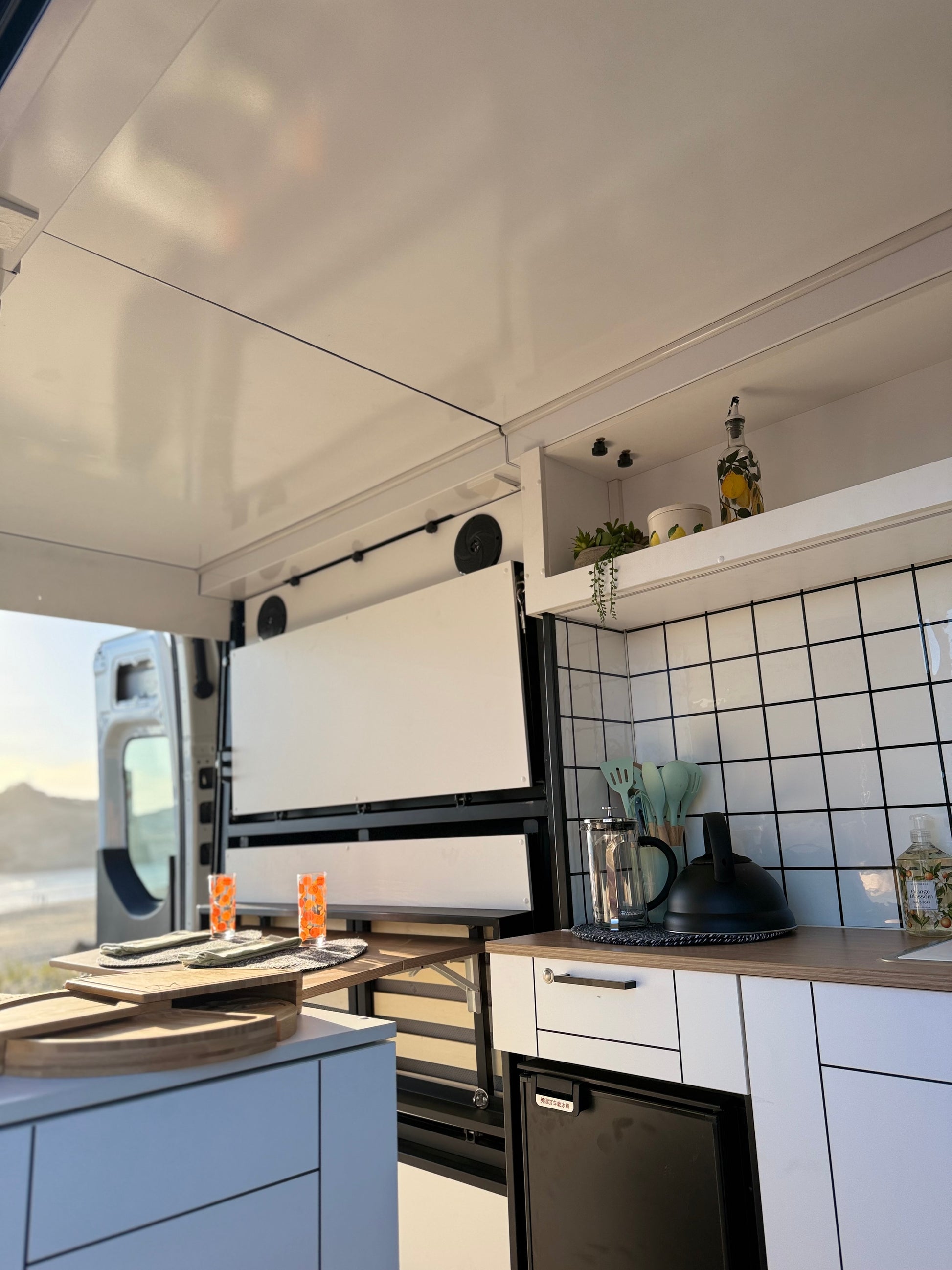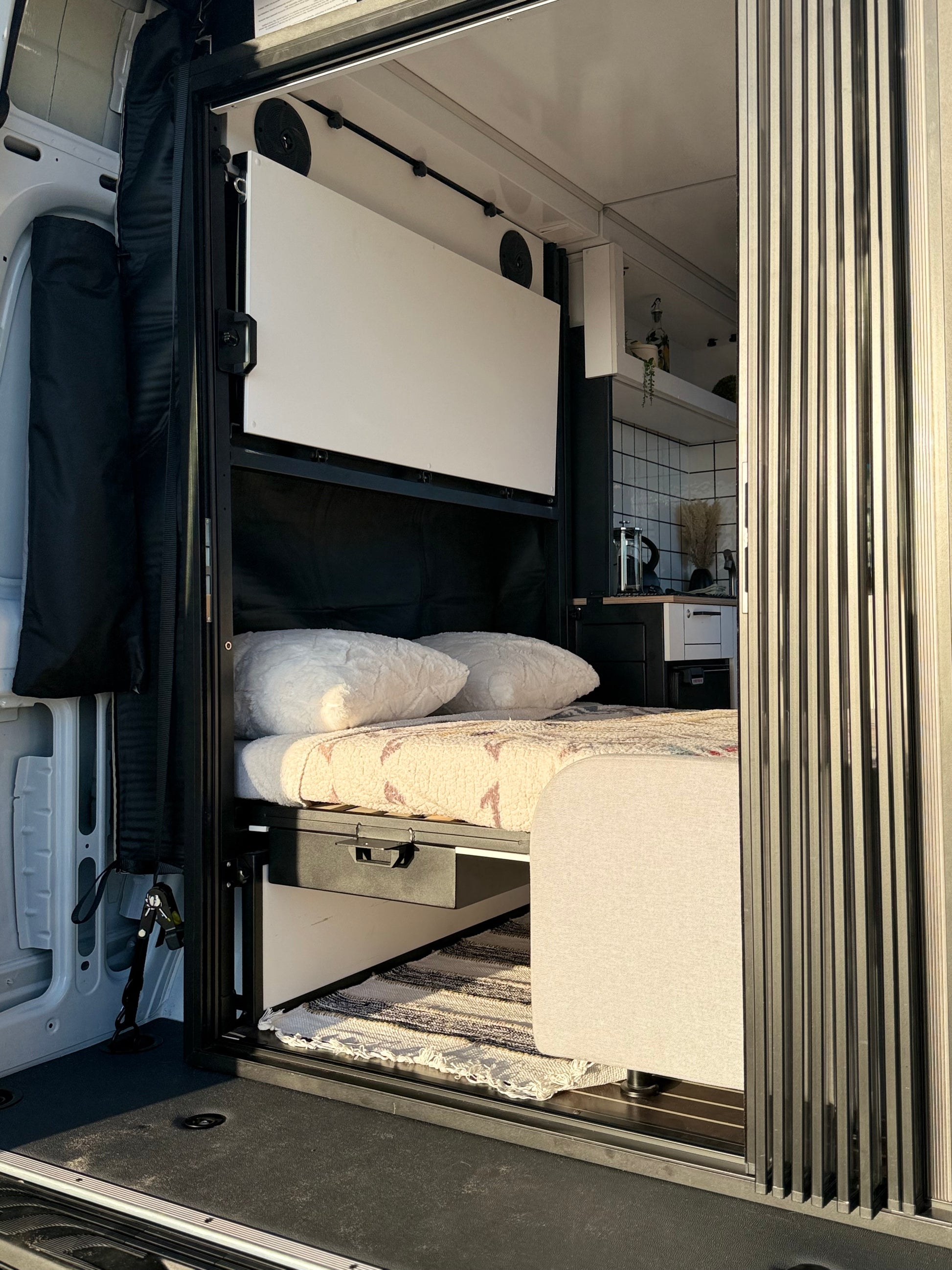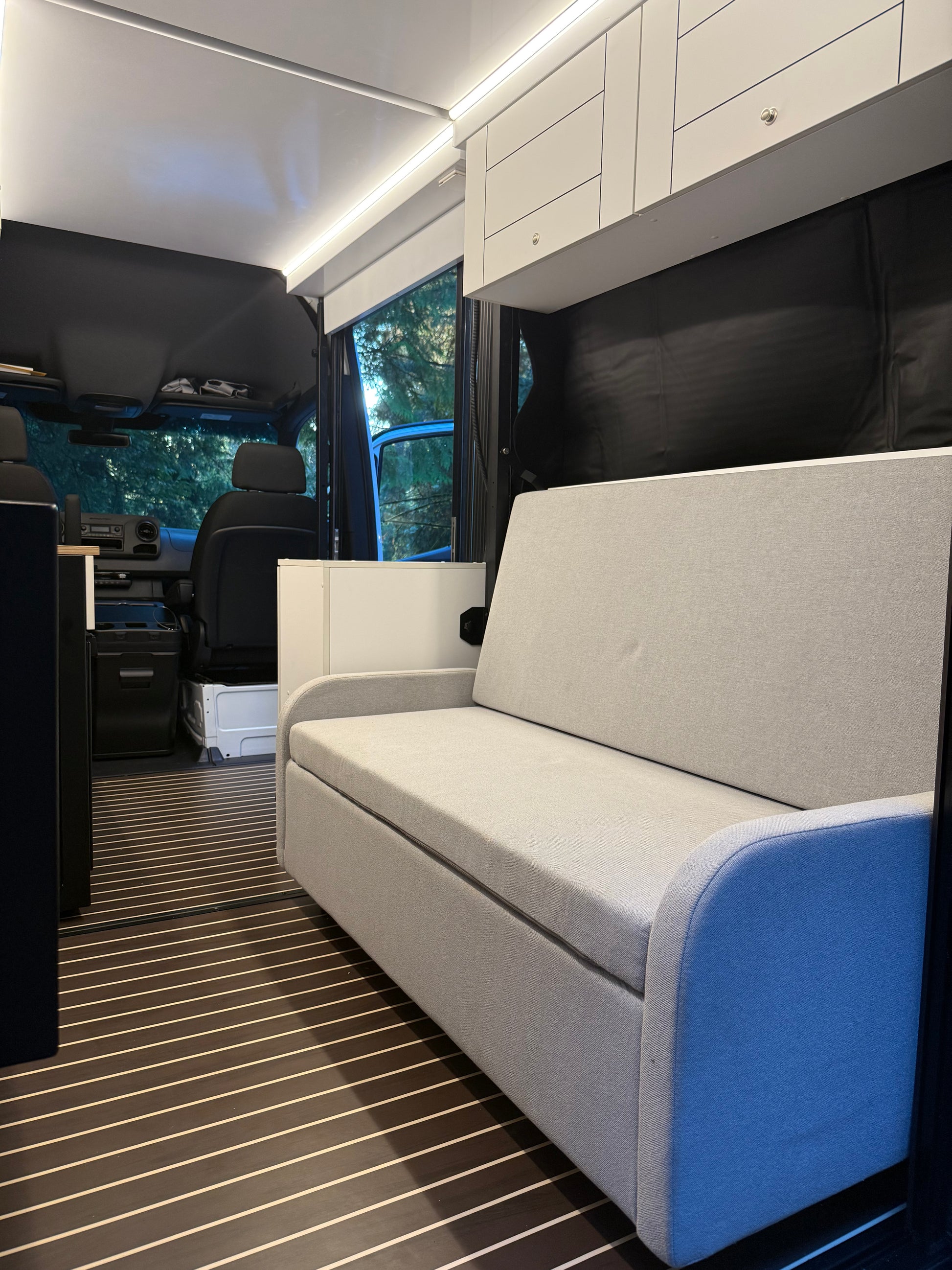 For families, our folding kids' bed (with detachable rail) is a versatile addition, designed to stow seamlessly above the bed or couch area when not in use. If a shower is a priority, our optional shower box provides on-the-go convenience. Please note that this feature replaces the walkway between the driver and passenger seats, making the side and rear doors the primary access points to the living space.