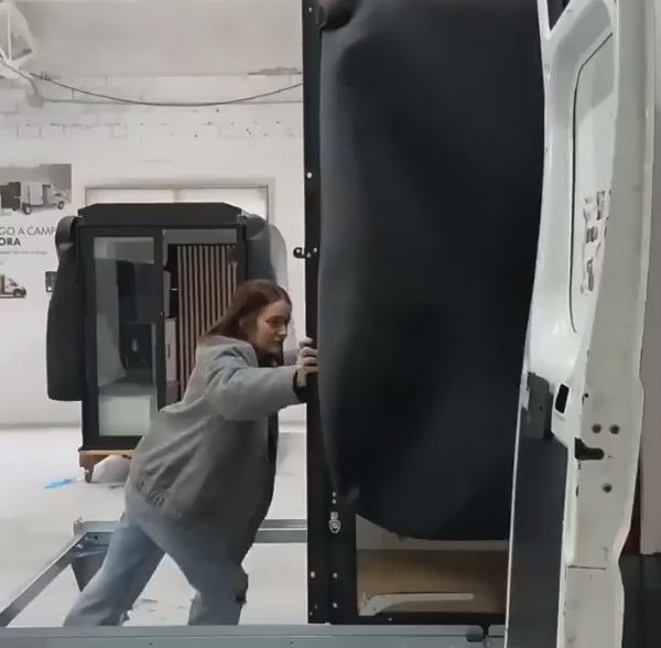 Conversion Van kits are made to order. We require $5k deposit to begin production, and the remaining balance due when the kit is finished with production and ready to ship. Typical production time is 3 months, and about 1-2 weeks to ship domestic ground shipping across the United States. Installation can be done in less than an hour, but can vary significantly based on skill and experience. It helps to have multiple people at installation to fit the box into place.