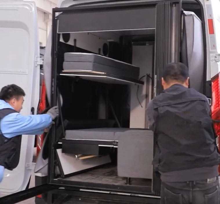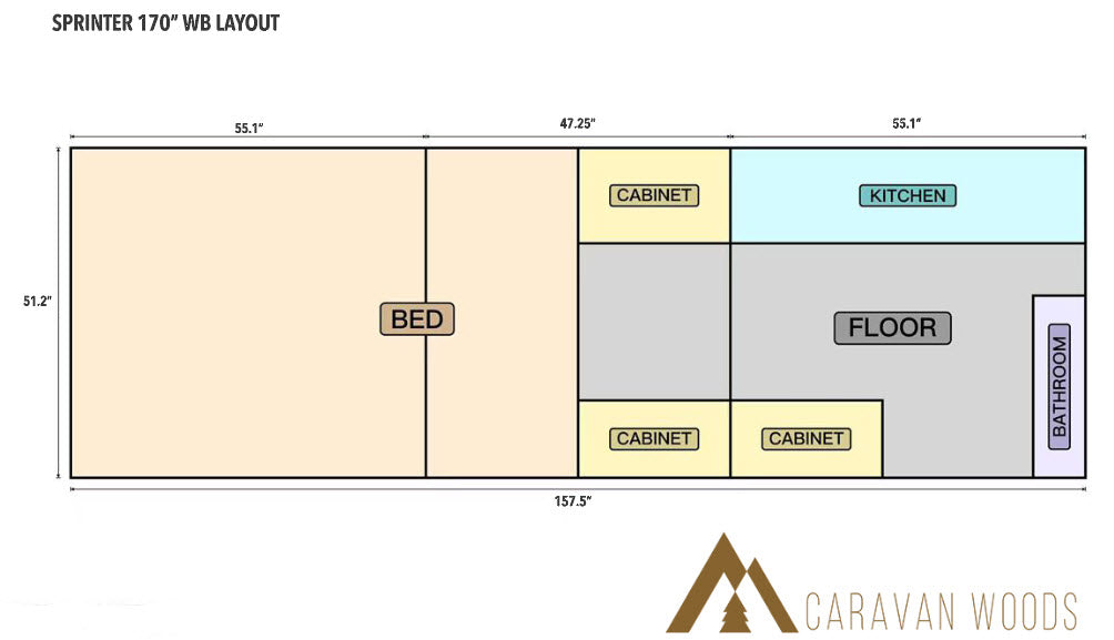 We've done the 99% of the work for you! The streamlined installation process and included mounting hardware make it easy to customize while maintaining solid structural integrity. Once the two kits are installed into the van and fitted into place, they will expand outwards towards the edge of the walls, maximizing the interior space, providing a perfect fit for your vehicle. All cabinetry, walls, couches, etc. come assembled so all that is required is a flat flooring surface to install the boxes into. This can be as simple as providing a cut plywood floor for your vehicle. Many new Sprinter vans purchased from dealerships will already have a floor preinstalled for easy convenience.