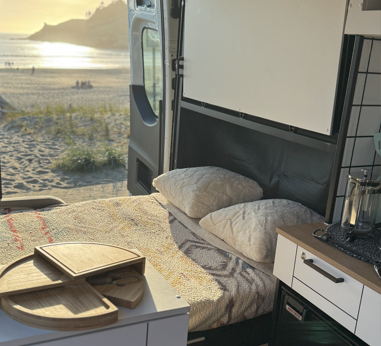 For extra privacy, comfort, and a bit more control over heating and cooling, check out our sliding glass door option. These doors let you open up your van while staying protected from the elements, enjoying natural light, or even adding a little extra security. If the doors are not selected, the space will be open once the van doors are opened.