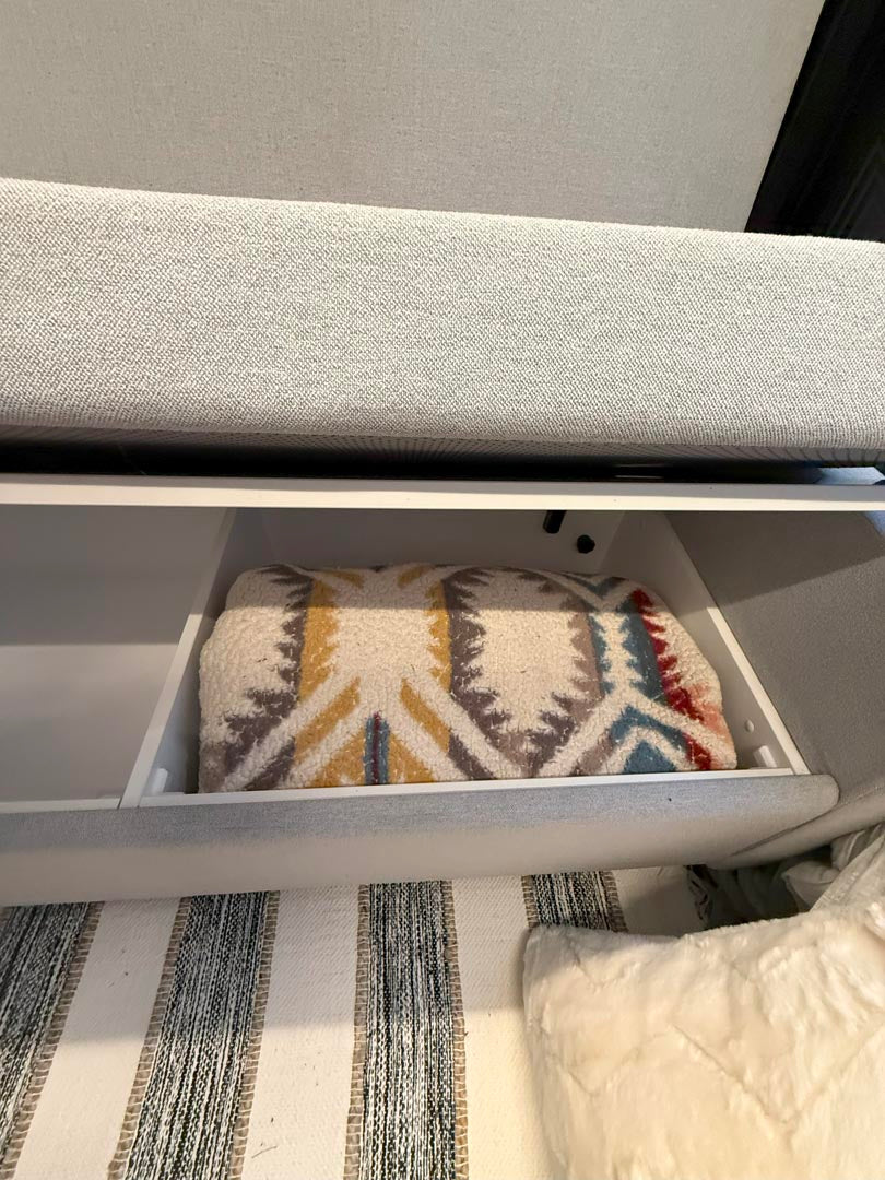Bringing the kids along? Our folding kids’ bed is a super handy addition—it folds up neatly above the bed or couch area when not in use. Need a shower on the go? We’ve got you covered with our shower box option. Just a heads-up: choosing this feature means the doorway between the front seats will be replaced, so you’ll use the side and rear doors to get into your living space.